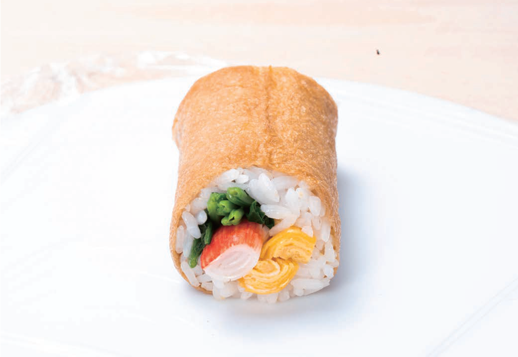 - 味付いなりの皮の両側をキッチンばさみで切り、縦長にします。ラップの上に縦長にした皮をおき、4等分した酢飯を全体に広げます。中心より少し手前に玉子焼き、ほうれん草、カニかまぼこ1本半をのせて、マヨネーズを絞り、手前から巻き、ラップで包んで落ち着かせます。