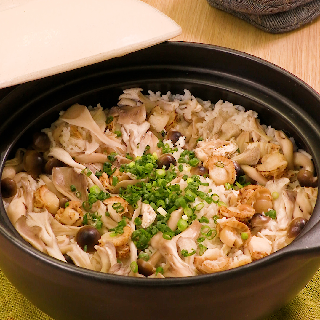 - 土鍋に米、しょうが、☆を入れて混ぜ、平にならす。しめじ、まいたけ、ベビーホタテを広げて加える。