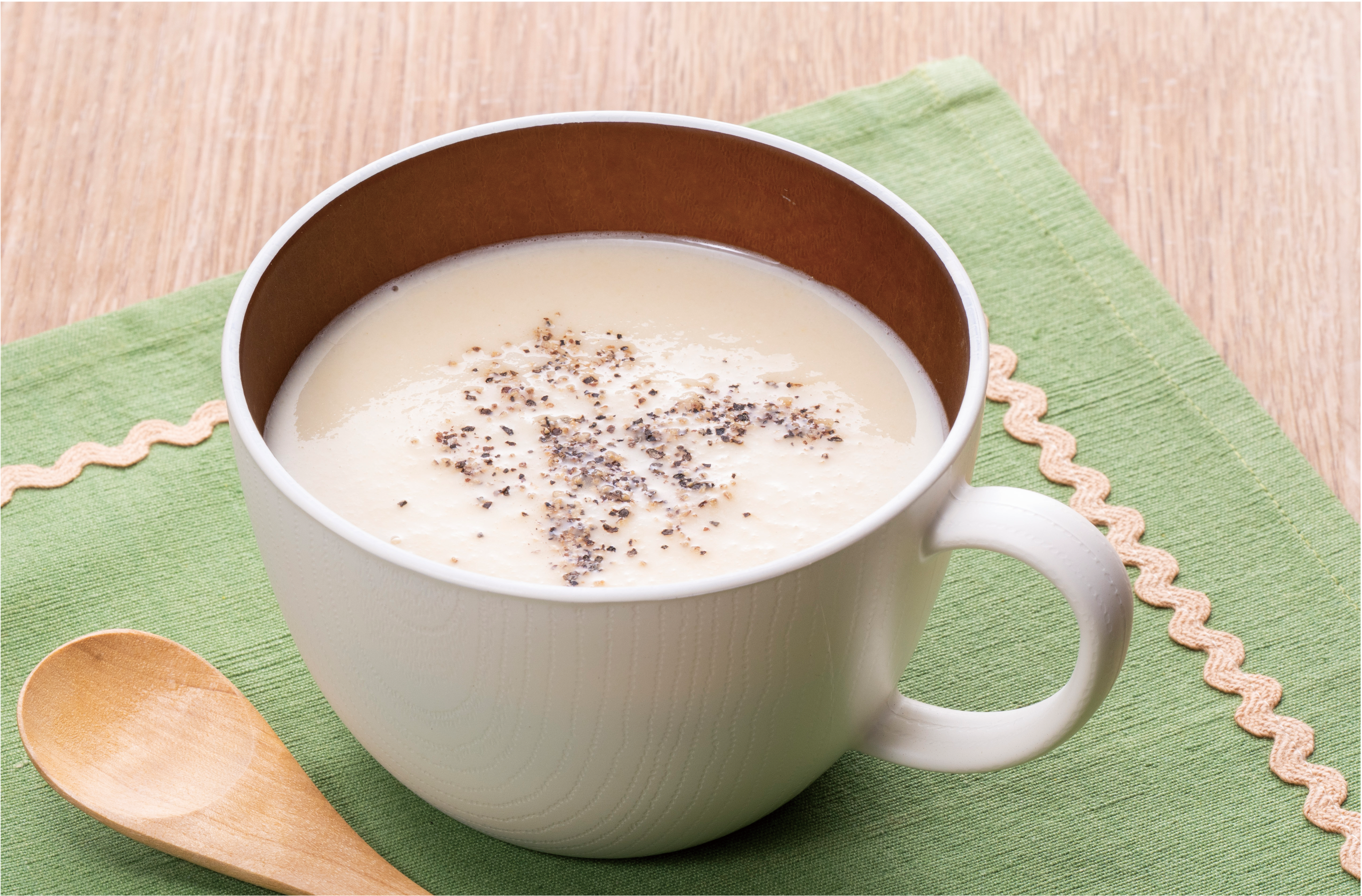- ミキサーに入れて、なめらかになるまで攪拌し、鍋に戻します。牛乳を加えて沸かし、塩とこしょうで味を調えます。器によそいお好みでブラックペッパーを散らして完成です。