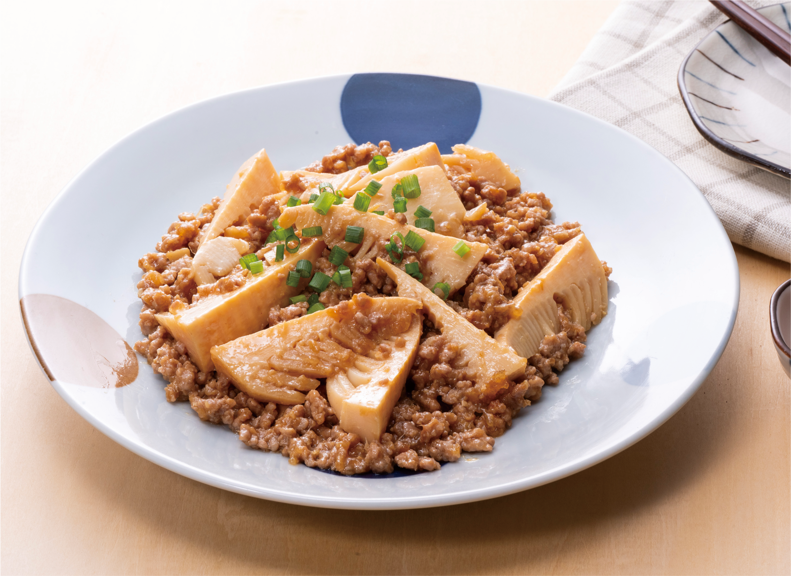 - フライパンでごま油を熱し、ひき肉を入れて炒めます。ある程度火が通ったら<A>を加えて炒め、①のたけのこを加えて混ぜ合わせます。