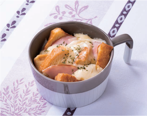- 食パン、ハムを食べやすい大きさにちぎりながら加え混ぜます。ピザ用チーズをのせて、ふんわりとラップをして、電子レンジ(600W)で3分加熱し、仕上げにパセリを散らします。
