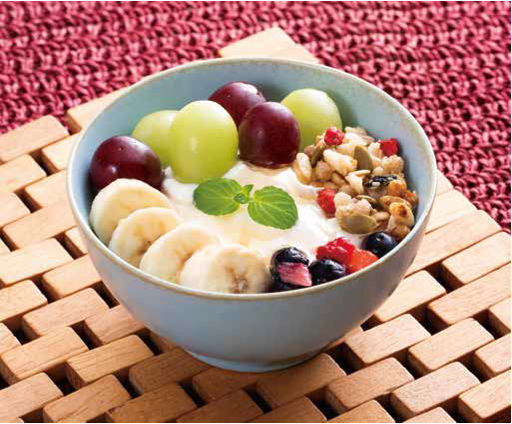 - ①の水切りヨーグルトに、果物、グラノーラなどを盛り付け、はちみつをかけて完成です。