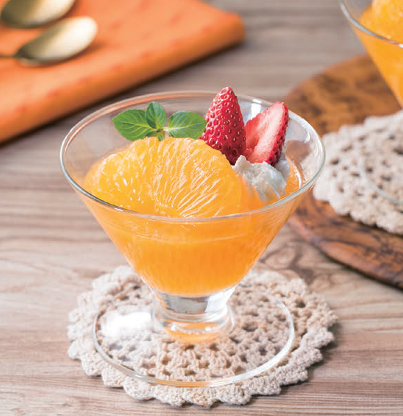 - 果汁とほぐした実を合わせて400mlになるようにします(足りないときは水を足します)。そのうち100mlを小鍋に入れ、砂糖(30g)を加えて沸騰直前まで温め火をとめてゼラチンを入れ溶かします。残り300mlを加えて器に流し冷やし固めます。