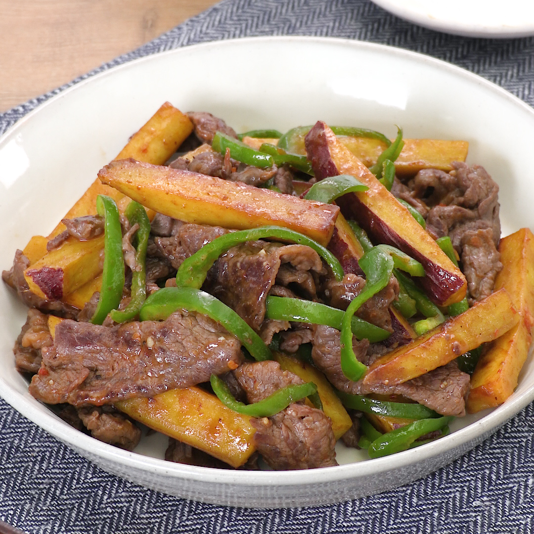 - キッチンペーパーで余分な油をふきとり、ごま油、豆板醤、おろしにんにく、おろししょうがを入れて香りが立つまで弱火で 炒める。牛肉を加えて肉の色が変わるまで中火で炒め、さつまいも、ピーマンを加えて、さっと炒め合わせる。