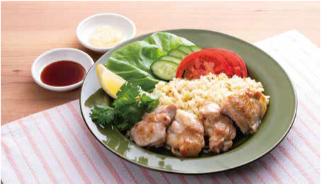 - お皿にごはん、鶏肉、付け合わせの野菜、タレ2種類を添えて完成です。