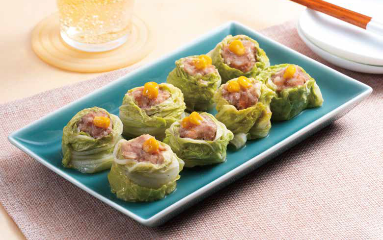 - ①の白菜1枚をおき、手前端に③のたねをのせ、巻き上げます。他も同じように作り、耐熱皿に並べて上にコーンを飾り、ふんわりとラップをかけます。電子レンジ(600W)で6~7分加熱し、粗熱がとれるまで数分そのままにして余熱で火を通し完成です。お好みでポン酢やからしなどで召し上がってください。