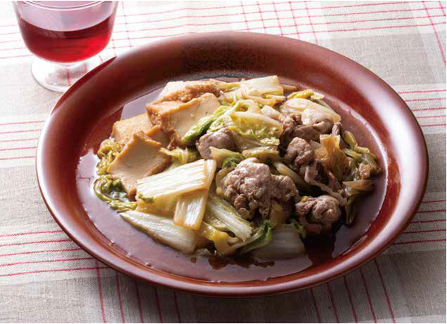 - フライパンでサラダ油を熱し、厚揚げ、ねぎを入れて焼きます。焼き色がついたら豚肉、白菜の芯を入れて炒め、葉も加えます。