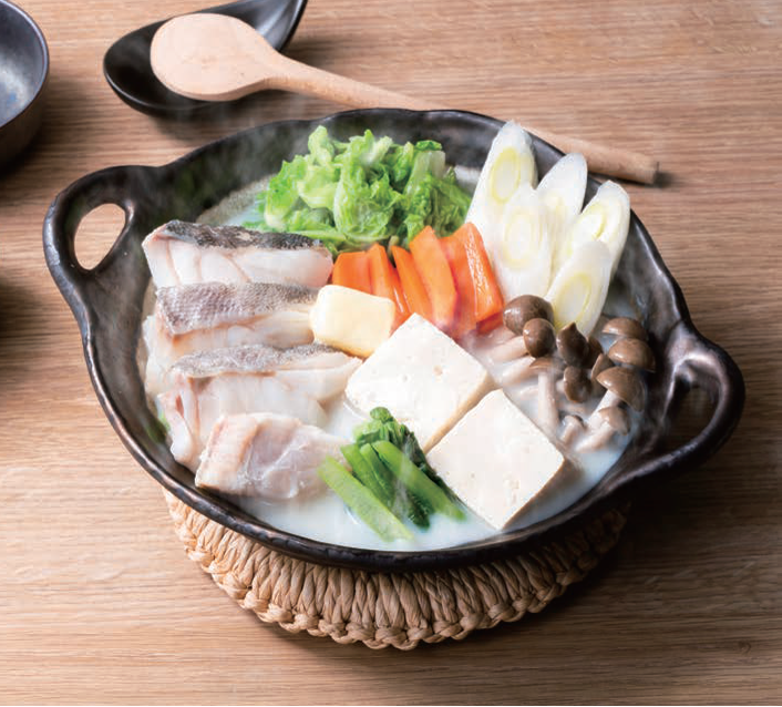 - 白菜・小松菜はざく切り、長ねぎは斜め切り、にんじんは短冊切り、しめじは石づきを取りほぐします。真だらは半分に切り、豆腐は4等分にします。