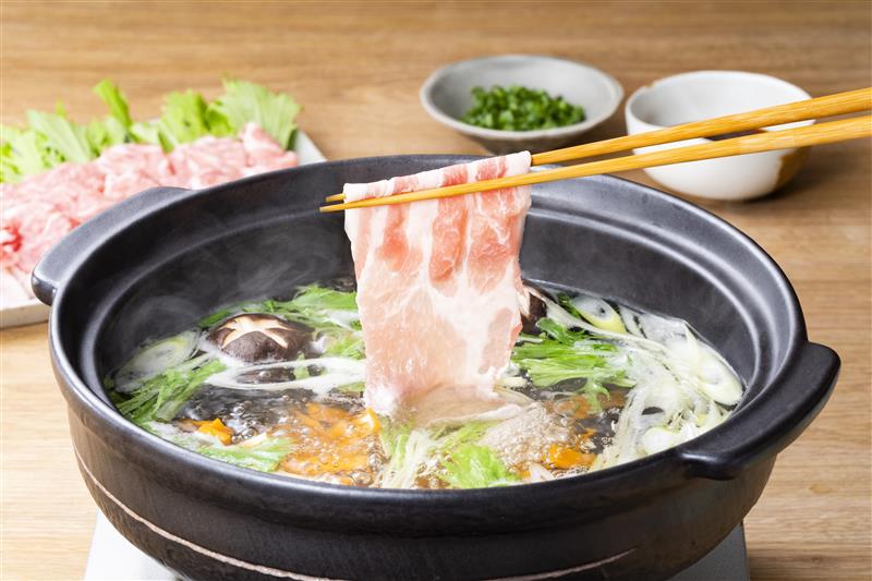 - 沸騰したら野菜、豆腐を入れます。再度沸騰したら弱火にして、お肉をくぐらせ、火が通ったら完成です。ポン酢に小ねぎを入れたタレでお召し上がりください。