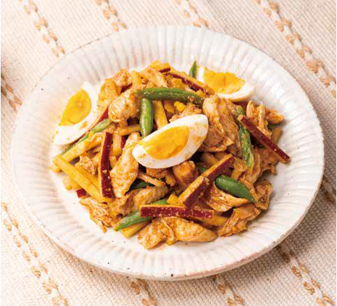 - ボウルに<A>を混ぜ合わせ、①②を加え混ぜ、最後に食べやすく切ったゆで卵を加えてさっと和えます。