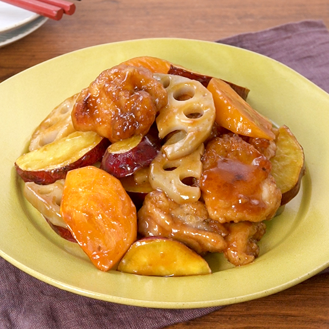- 計量カップに★を入れて混ぜる。別のフライパンに柿、⑤の鶏肉、③のさつまいも、れんこんを入れる。★を加え、とろみがつくまで混ぜながら中火で加熱する。